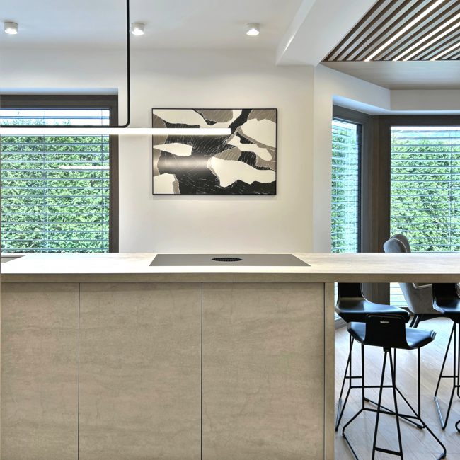 Kompleksowy projekt zakładający gruntowny remont domu po kilkunastu latach zamieszkania to wyzwanie projektowe, które bardzo lubię. Całość projektu bazuje na ukochanych przez panią inwestor beżach i ciepłych szarościach oraz subtelnych akcentach grafitów, czerni i ciemnych brązów.