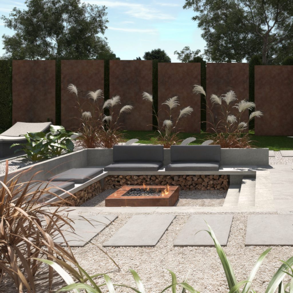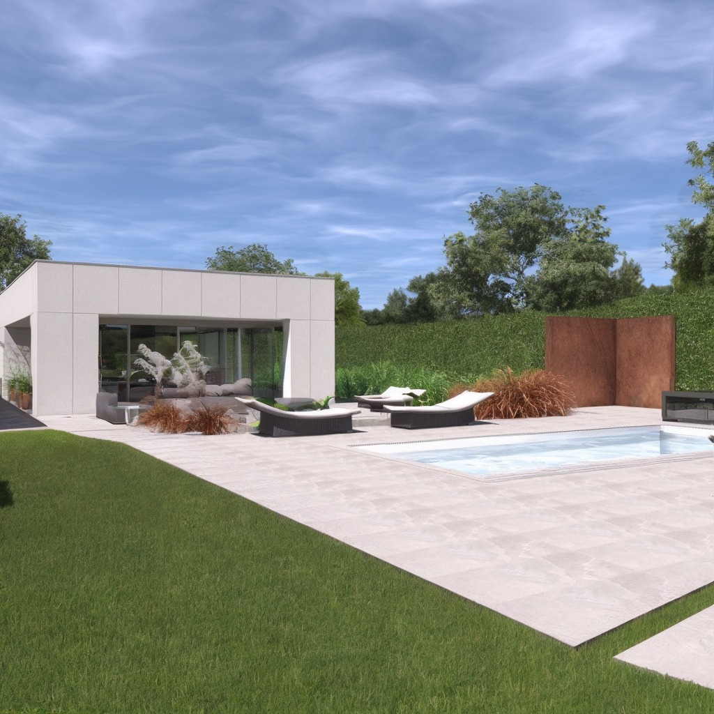 Okazały ogród łączący nowoczesną przeszkloną altanę i otaczającą ją przestrzeń rekreacyjną ze zmodernizowanym wcześniej domem, uspójnił całość projektu. Podgrzewany basen, miejsce na ognisko w nowoczesnym wydaniu i geometryczna fontanna widoczna z okien salonu, tworzą spójne założenie z roślinnością kwitnącą kolorami złamanej bieli, rudościami i brązami. Kaskadowe betonowe tarasy wokół domu, alejki i przestrzeń wokół altany pokrywa płytka o delikatnym kamiennym rysunku nadająca szlachetności betonowym formom.