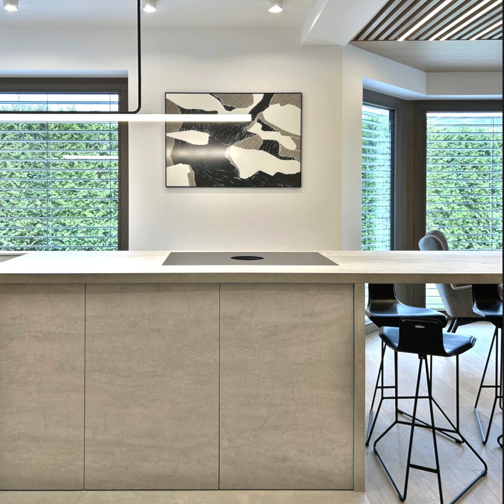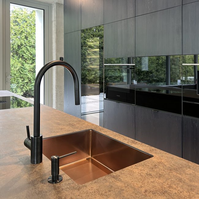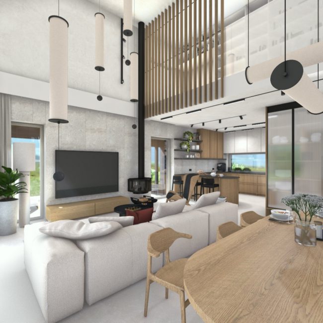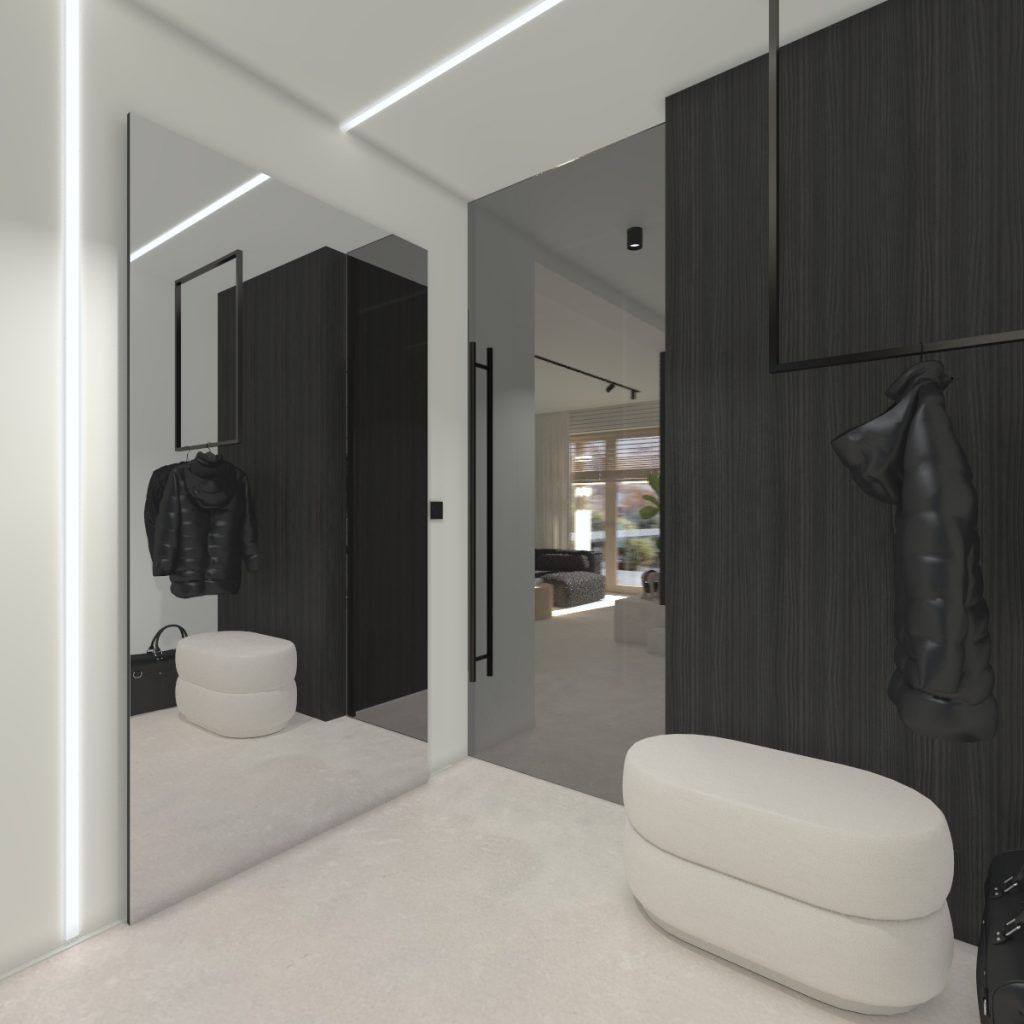 Projekt przestrzeni wewnątrz budynku subtelnie nawiązujący do stylistyki japandi. Nietypowe dla stylu przełamanie kontrastowymi akcentami stanowi dialog dla elewacji utrzymanej w odcieniach czerni. Szukanie dialogu między wnętrzem i zewnętrzem budynku bywa trudne gdy podobają nam się odmienne style, czasem pozornie niemożliwe, ale jest osiągalne.