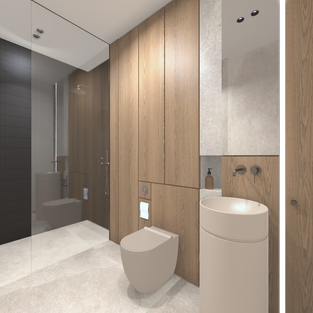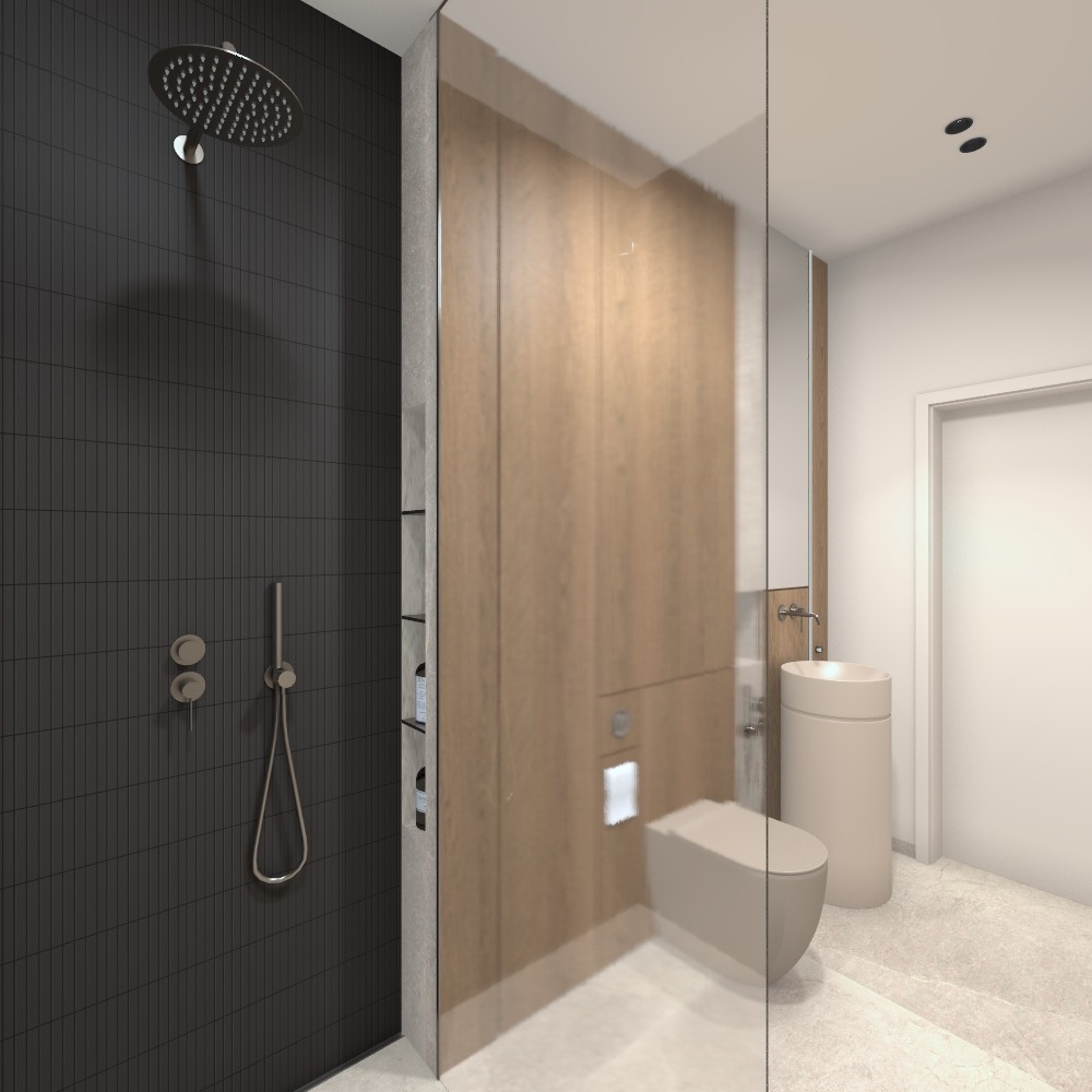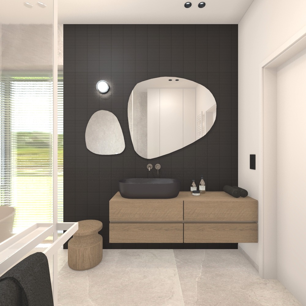 Wnętrza czerpią kluczowe założenia ze stylistyki japandi. Spokojne formy, oszczędność w wypełnieniu przestrzeni i naturalne materiały to to co kojarzymy z tą stylistyką. Użycia ciemniejszych materiałów do stylu japandi nie da się przypisać, ale właśnie o to chodzi w projektowaniu by czerpać z różnych styli to co do nas przemawia, by „przemycić” nieco klimat, a pominąć to co do nas nie pasuje.